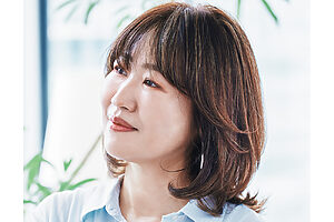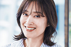 ロングヘアが定番という斉藤さん。肌色や瞳の色に合わせた淡いピンクブラウンをベースに、表面と衿足に、白髪をぼかすハイライトをオン。白髪染めでは叶わない、明るくおしゃれな髪色に。可憐な顔立ちを際立たせる前髪もポイント。「肌が明るく映え、ツヤ感が出るように、明るめのベージュをハイライトに入れました。衿足は太めに入れているので、アップにしても表情が出ます」(野村亮さん)