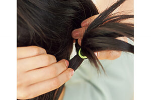 結び目にさしこむだけで楽しめるヘアカフは今おすすめのアイテム、とヘア&メイクアップアーティストの高松由佳さん。
