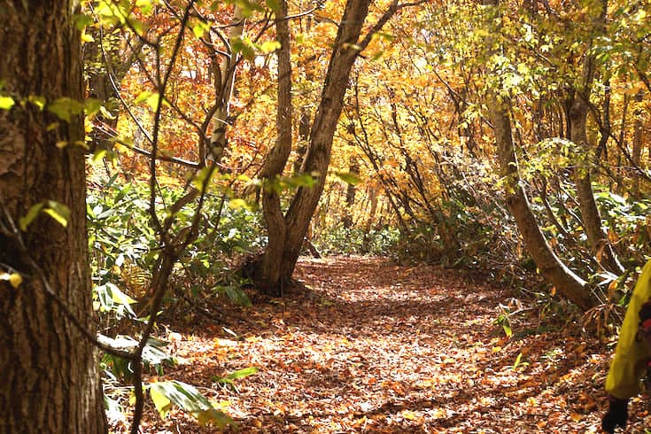 秋の奥志賀高原の森林セラピーコースは、一歩踏み出すと、ふかふかの落ち葉のクッションが、極上のカーペットの上を歩いているような気持ちにさせてくれる。ウォーキングシューズや軽やかなトレッキングシューズならではの足から伝わるやさしさ、ぬくもりはまた格別。10分も歩けば、気持ちが自然にほどけていく。