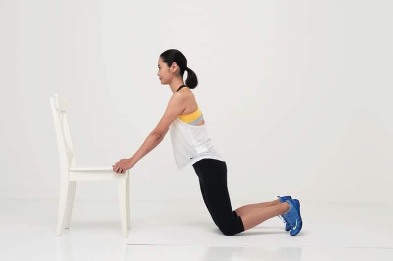 床に膝立ちになり、両手で椅子の座面を掴む。頭から膝までをやや前傾させてまっすぐにキープ。