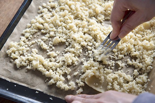 3、100度のオーブンで10〜15分焼いて一度取り出し、フォークでフレーク状にする。オーブンにもどして、さらに15分〜、水分が飛んでサラサラになるまで焼く。