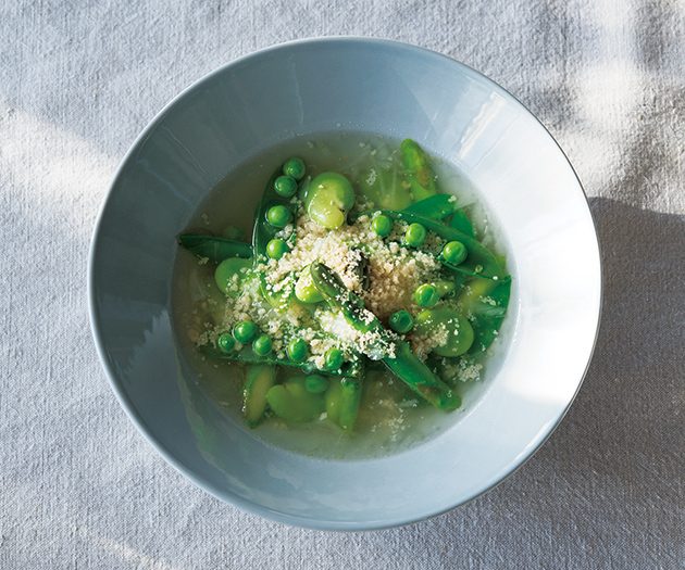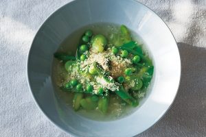 2、好みの春野菜を加えてさっと煮て、味をみて、海塩、こしょうで調える。器に盛り、酒粕粉チーズをふる。