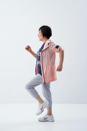 「仕事中の移動は、なるべく歩きます。原宿ー表参道間は序の口、常に急ぎ足か小走りです」。しかもハイヒールを履いて、バレーボールの体力づくりを兼ねる。さらに長時間PCに向かっていると猫背になるので、姿勢を正す歩き方を習慣に。「デューク更家さんの本を書いたときに教わったのですが、前かがみにならないよう目線を上げて、肘は身体の脇より後ろに引くことを意識します」。肘を後ろに大きく引くことで肩甲骨がよく動き、背中の筋肉が鍛えられ、姿勢がよくなる。また、膝を高く上げて、太ももや腹筋も同時に鍛える。