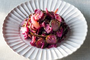 昔、OLらしき女性が帰宅するやいなや「あ~、柴漬け食べたい!」とつぶやいたあのCMを覚えていませんか?(いないかな)ときおり無性に食べたくなるのは、不思議なくらい。歯触りがしゃきっとして、酸っぱさが背中を押してくれる感じがするのかしら??? 炊きたてのご飯にのせて・・・もいいけれど、柴漬け×ビール、柴漬け×熱い番茶、柴漬け×焼酎のお湯割りなんかも、いけます。白崎さんのレシピのよいところは、「あ~、柴漬け食べたい」と思ったら、すぐ作れるところ。食べたいから、作ろう~っと。(担当編集・K)