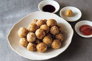 このお皿、目の前にどんと出されたら、誰もが「ミートボールだ!」と大喜びするはず。もしかしたら、食べてもわからない。フフン、雑穀だけで作ったのに。動物性の材料は一切入っていないのに。君たち、味、わかるの~? といばりたくなりました(私だけです、きっと)。そして食べてわかる、食べ応え。でいて、あとのお腹が重くないのです!!! このまま食べてもちろんおいしい。でも、この冬、鍋に入れることをご提案します。油で揚げてあるからコクが出ます。味噌汁の具にもいいですし、お弁当には最適です。次回紹介する「トマトソース」では、この雑穀ボールを和えてみたので、お楽しみに!(担当編集・K)