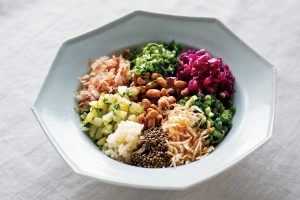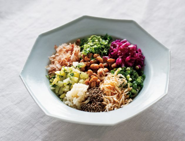納豆のほかに8種の食材! たんぱく質・ビタミンともに栄養価の高い贅沢な一品。一度に作り置きをしておき、オイルはその都度加えてもよい。
