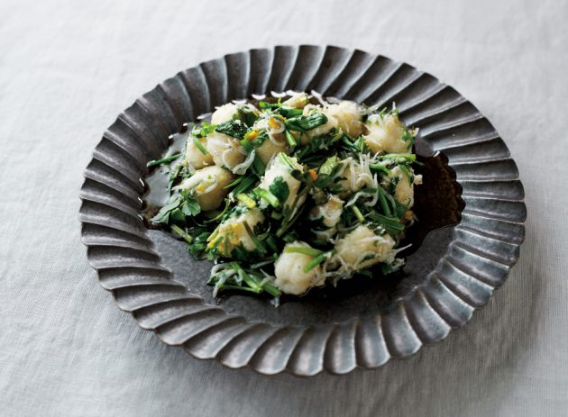 3. フライパンににんにくとカメリナオイルを入れて火にかけ、にんにくの香りが出たらしらすと柚子胡椒、茹で上がったおからニョッキ、茹で汁大匙2を加えて混ぜ合わせ、ふつふつとしたらせりを加えてざっくりと混ぜ合わせ、塩で味を調えて火を止める。