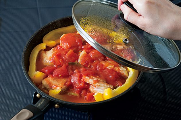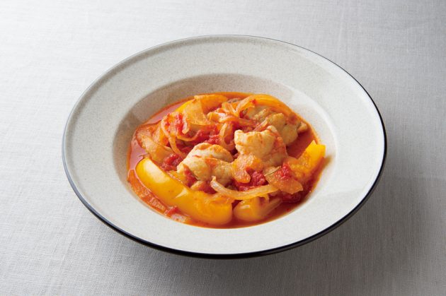 グルタミン酸を含むトマトと、イノシン酸を含む鶏肉を組み合わせた洋風の煮込み料理。ダイエット中のメインディッシュに最適だ。「トマトと鶏肉の組み合わせがポイントですが、同じくグルタミン酸を含む玉ねぎや香味野菜のセロリも使うため、さらに風味が重なりおいしさにつながります」(平松さん)。鶏肉はノンオイルで香ばしくソテーしてから煮込むため、ボリュームのわりにカロリーも抑えられる。じっくりと煮込むことによって、コラーゲンが溶け出してソースにコクが出るうえ、鶏肉が柔らかく仕上がる。応用として、肉を魚に替えてもいい。