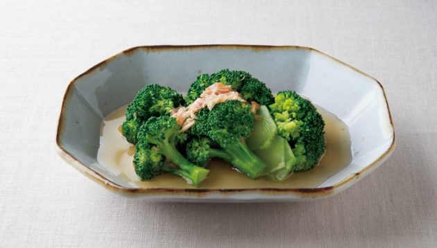 昆布と同じくグルタミン酸が豊富なブロッコリーと、イノシン酸を含む鰹節を組み合わせることで、だしを使わなくても少量でうま味を感じるおひたしが作れる。ブロッコリーのうま味をなるべく逃がさず使うには、小さめの鍋、少ない湯で加熱するのがポイント。食感がしっかり残る程度に硬めにゆでて、流水にさらさずあおいで粗熱をとれば、うま味を失わない。ゆで汁を利用したつけ汁で、ブロッコリーに鰹節の風味をつける。ブロッコリー同様グルタミン酸を含む、アスパラや菜の花でも代用できる。漬け込み時間は必要だが、手軽に作れる副菜だ。