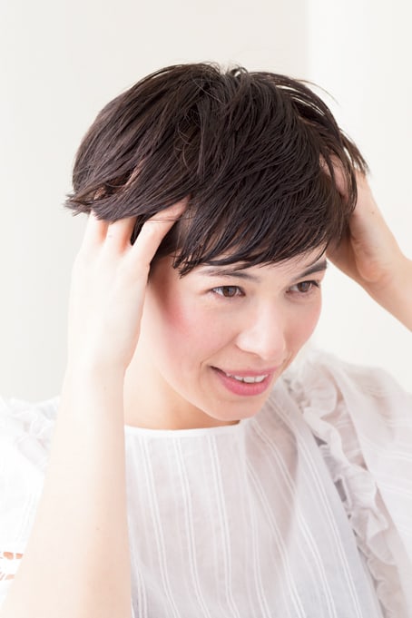 「ふくらみやすい乾燥毛ですが、オイルをなじませるだけで簡単にセットできるよう、くせを見ながら慎重にカット。ぼんのくぼの髪を短くし、耳まわりとつなげることで頭の形を美しく見せています。トップにかけたパーマでボリュームとやわらかさをプラスしました。」(Praha ヘアスタイリスト 阿部あゆみさん)
