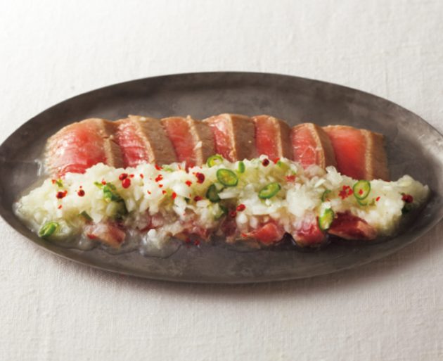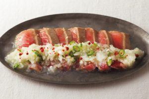 脂ののったマグロにはDHAやEPAが豊富。同時にビタミンEを含み、酸化しやすい欠点も補える。血流改善に効果のあるケルセチンを含む玉ねぎソースで、ダブルの効果を狙って。