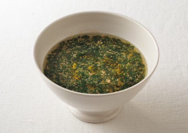 2. 鍋に出汁を煮立て、タラコを加える。再び煮立ったらモロヘイヤを加え、しんなりしたら火を止めて器に盛り、オリーブオイルを垂らす。