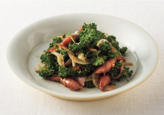 1. ホタルイカは、気になれば下処理(目と口、軟骨を取り除く)をする。パセリは太い茎から葉を摘み取る。玉ねぎは薄切りにする。