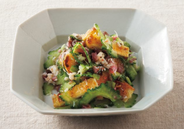 あぶり油揚げとゴーヤの蟹柴漬け和え