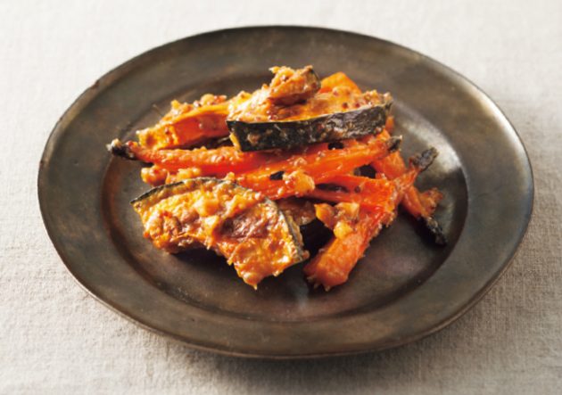 1. にんじんは皮ごと縦に棒状に切る。かぼちゃと共にオーブンシートを敷いた天板に並べ、220℃に熱したオーブンで15分ほど焼く。
