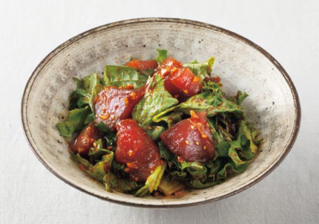 鰹刺身さく160g フリルレタス6枚 にんにく(みじん切り)小さじ1 塩小さじ1/3 A[にんにく(みじん切り)小さじ1 コチュジャン小さじ2 オイスターソース小さじ2 ラー油小さじ1/2] すりごま適宜