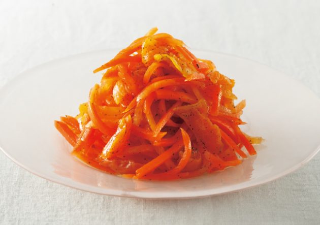1. にんじん、パプリカはせん切りに、ドライアプリコットは細切りにする。