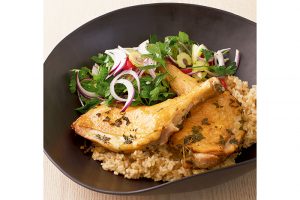 5 皿に玄米を盛り、焼き上がった鶏肉をのせ、野菜を添える。