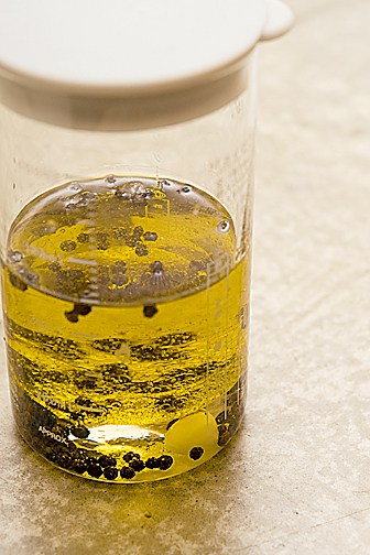 酢とE.Vオリーブオイル、にんにく、粒黒胡椒をハンドミキサーにかけると、マヨネーズ状のドレッシングに。「酢とオイルの割合は1:2。酢の種類によって割合が変わります」
