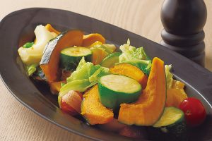 キャベツ、玉ねぎ、ズッキーニ、ピーマン、かぼちゃ、プチトマト(量は好みで)、E.Vオリーブオイル、塩、粒黒胡椒