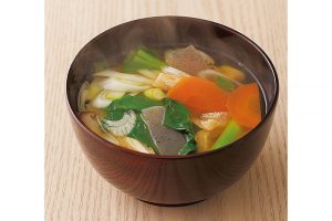 小松菜、にんじん、椎茸、ねぎ、油揚げ、こんにゃく、煮干しの水だし