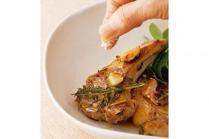 骨つき子羊肉、にんにく、ローズマリー、塩、E.Vオリーブオイル
