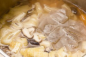 2 鍋にだしをはり、小松菜とねぎ以外の具を入れて煮る。