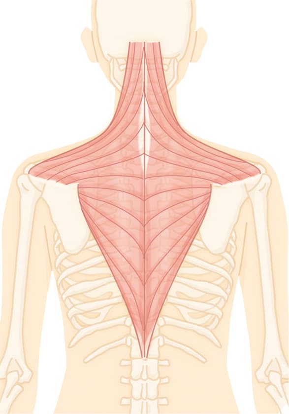 頑固な肩こりの主な原因になるのが、首の付け根から背中を覆う僧帽筋。とくに首の裏にある上部の筋肉はストレスで硬くなり、肩甲骨を覆う中部の筋肉は肩や背中のこりに関係するといわれている。ストレスやデスクワークで縮こまった筋肉をしっかり伸ばして。
