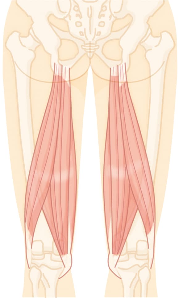 太ももの裏側にある筋肉で、歩くときの蹴り出しの動作などでよく使われる筋肉。欧米人に比べ日本人はこの部分の筋肉が弱く、しかも硬くなりがち。前屈が苦手なのは、このハムストリングスの硬さが原因ということも多い。静的ストレッチで苦手意識の克服を。