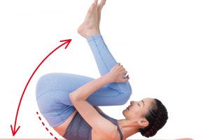 (1)膝を両腕で抱え、背中を丸めてできるだけ上体と膝を近づける。目線は膝に向けておき、後方に向けてゆっくり転がる。