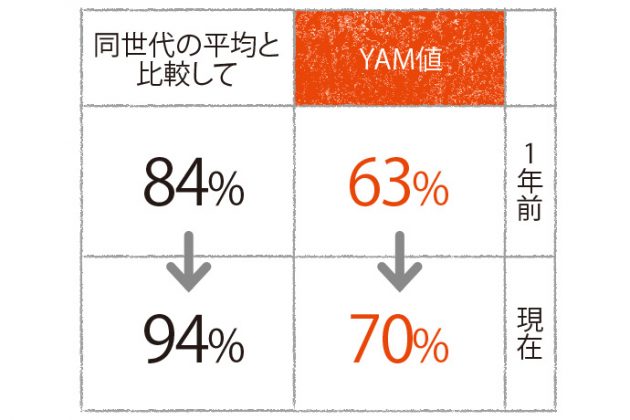 太田 YAM値というのですが、若いときの骨密度に比較して70%以下はすでに骨粗鬆症なんです。70〜80%までが予備群。春原さんは、2度目の骨折のときには治療を始めていなければならなかった。3度目の骨折をして、調べたときは、YAMは63%になっていましたものね。