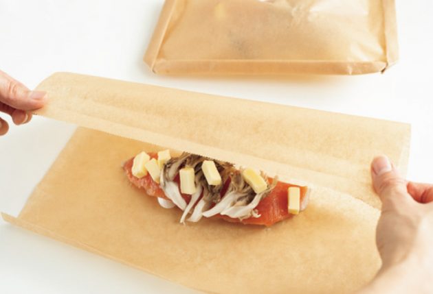 3. 30cm大に切ったオーブンシートを2枚用意。真ん中やや下に長ねぎを敷き、1を皮面を下にしてのせる。上に舞茸とちぎったバターをのせ、シートの上半分をかぶせて下と両端の3辺を1cm幅に2回上に折って包み、戻らないよう四隅を下に折りこむ。