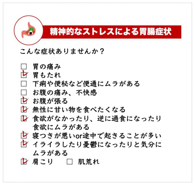 テストの結果、もっとも多くチェックが付いたのが、「精神的なストレスによる胃腸症状」。11項目中7項目が該当し、古庄さんは、ストレスから胃腸のトラブルを生じていることがわかりました。