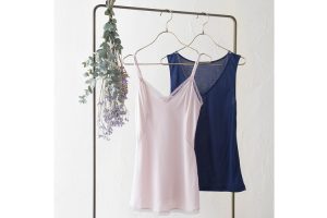 ラインナップは、ポリウレタン入りで着やすさを高めたシルクジョーゼットのキャミソール、ショーツ、フレンチパンティと、国産で光沢が美しいシルク100%のトップス2型。