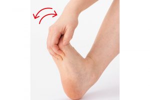 8.アキレス腱をつまんで5〜 10回プッシュ。アキレス腱は加齢により固まってくるので、もみほぐして柔軟性を取り戻す。