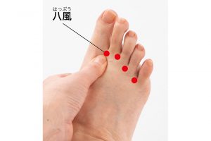 7.指の間をそれぞれ親指プッシュでもみほぐす。両足で8つある八風というツボで、血行を促進し、冷えを改善。