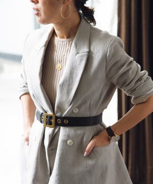 「ハイウエストで脚が長く見えるし、幅広のベルトで胃のあたりも抑えられる。ウエストマークを恐れちゃダメなの。ジャケットを肩にはおれば、ほら、わからないでしょう?」