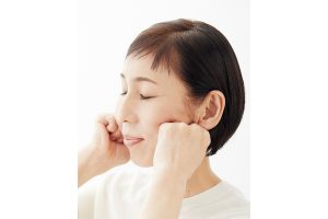 親指を耳の前にあるくぼみに当てて、曲げた人さし指を鼻の横に当てる。肌を押した親指を矢印の方向に動かし、凝りをもみほぐす。