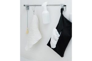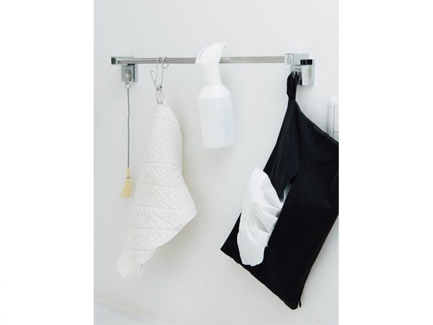 「幅をとる布類はしっかり挟めるピンチ型のフックがおすすめ。余ったスペースには、洗剤やブラシなどお掃除グッズを掛けています。特に、ティッシュは、髪の毛などのちょっとしたゴミを取るのに便利です」
