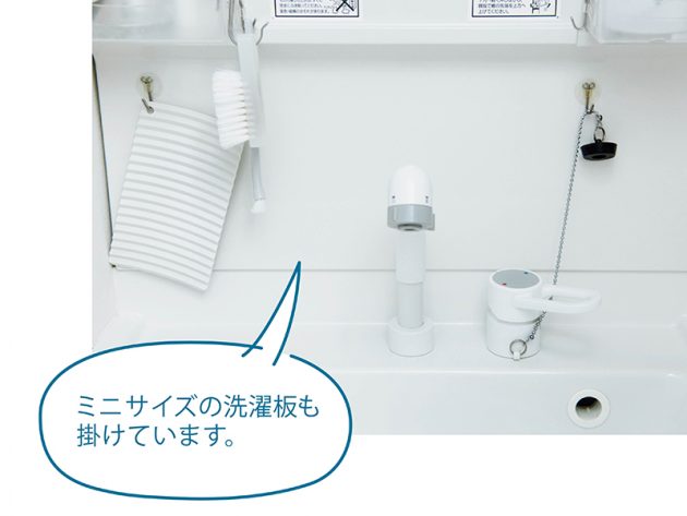 「ぬめりが気になるので、吸盤付きフックに栓を掛けておき、乾きやすいようにしています」。掃除ブラシをS字フックに吊るしておけば、手を洗うついでに気になる汚れも落とせる。ながら作業で、効率的な掃除を!