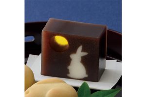 小豆の練り羊羹と錦玉羹、道明寺を重ねた三層細工羊羹。うさぎが満月に向かい飛び跳ねる様子に秋を感じる。
