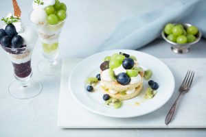 「シャインマスカットとナガノパープルのパンケーキ」は、大粒のシャインマスカットとナガノパープルを贅沢に使用したパンケーキ。