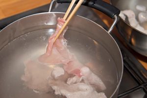 鍋にぬるめの湯を沸かし、豚肉を1枚ずつ広げて入れながら火を通し、冷水にとる。