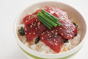 まぐろ(刺身用)1さく(約180g) A[みりん大さじ1 酒大さじ1] 醤油大さじ2 ごはん茶碗(大きめ)2杯 万能ねぎ2〜3本(2〜3cm長さに切る) 海苔、白いりごま各適量