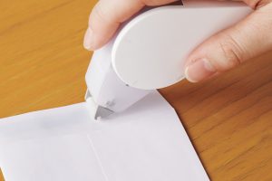横のバーをスライドさせて刃を出す携帯用のはさみ。コンパクトに持ち運べ、マスキングテープなどの粘着テープを切っても刃がべたつかない。「キャップを外す必要がないので、片手で切り始められて使い勝手がいいです」(コクヨ広報)