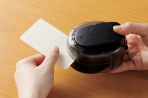 とがった角を丸くするコーナーカッター。角の大きさは3サイズから選べる。「私はラミネートしたPOPの角を丸くするのに使っていますが、名刺やカードなど、身の回りのさまざまなものにおすすめです」