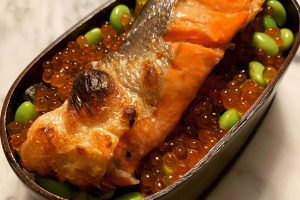 投稿にはのり弁とありますが、鮭といくらの豪華な親子のっけ弁当。枝豆を入れることで、食感が楽しくなるアイデア。一度でいいから食べてみたい弁当です!
