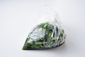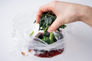 1.ポリ袋にめんつゆと凍ったままの冷凍ほうれん草を入れて全体になじませ、室温で20〜30分ほど置く。