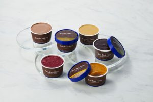「ソルベ カカオ フランボワーズ」は、赤いドライフルーツのような味わいのヴェネズエラ産カカオのソルベと、果肉を感じる甘酸っぱいフランボワーズソースの組合せ。「グラス オ ショコラ パッション」は、パッションフルーツ風味のマイルドな味わいのアイスに、爽やかな酸味のパッションフルーツソースを合わせた。