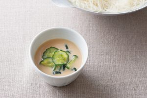きゅうり1/2本を小口切りにして塩小さじ1/4を振り、10分ほどおいて水気を絞る。豆乳1カップにめんつゆ1/3カップを入れて混ぜ、きゅうりを加える。